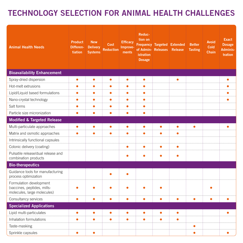 View Technology Selection for Animal HealthToday, success is achieved by differentiating products in the marketplace. Capsugel collaborates with animal health and nutritional companies on the design, development and commercial manufacture of specialized dosage forms to better meet the product performance needs of farmers, producers and pet owners. By partnering with us, customers can achieve a distinct competitive advantage. By leveraging our integrated approach, customers benefit from Capsugel’s expertise in guiding their product from start to finish with a single point of contact, minimizing time and cost.